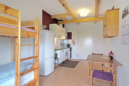 Raumhöhe 2,70 mtr. sichtbare Balkenlage. Küchenzeile mit Mikrowelle, Backofen Herd Dunstabzugshaube Abluft, Toaster, Kaffeemaschine, Kühltruhe und Kühlschrank vorhanden, Duschbad mit Waschmaschine, Wohnung ist möbliert und mit TV und Radio ausgestattet. Fußboden vollflächig Laminat. Haustiere sind nicht gestattet. 1 x wöchentlich Grundreinigung