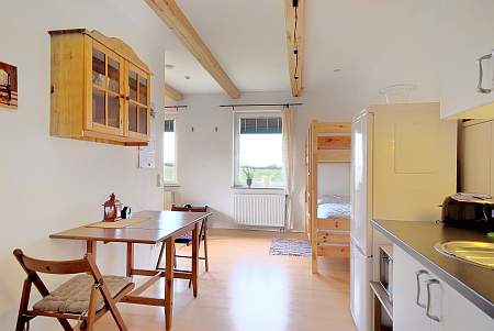 38 qm auf 1,5 Zimmer mit Blick auf Felder Westseite, sehr heller sanierter Altbau, Zentralheizung Pelletanlage, 800qm Parkplatz, 1000qm Gartennutzung. Nichtraucherwohnung